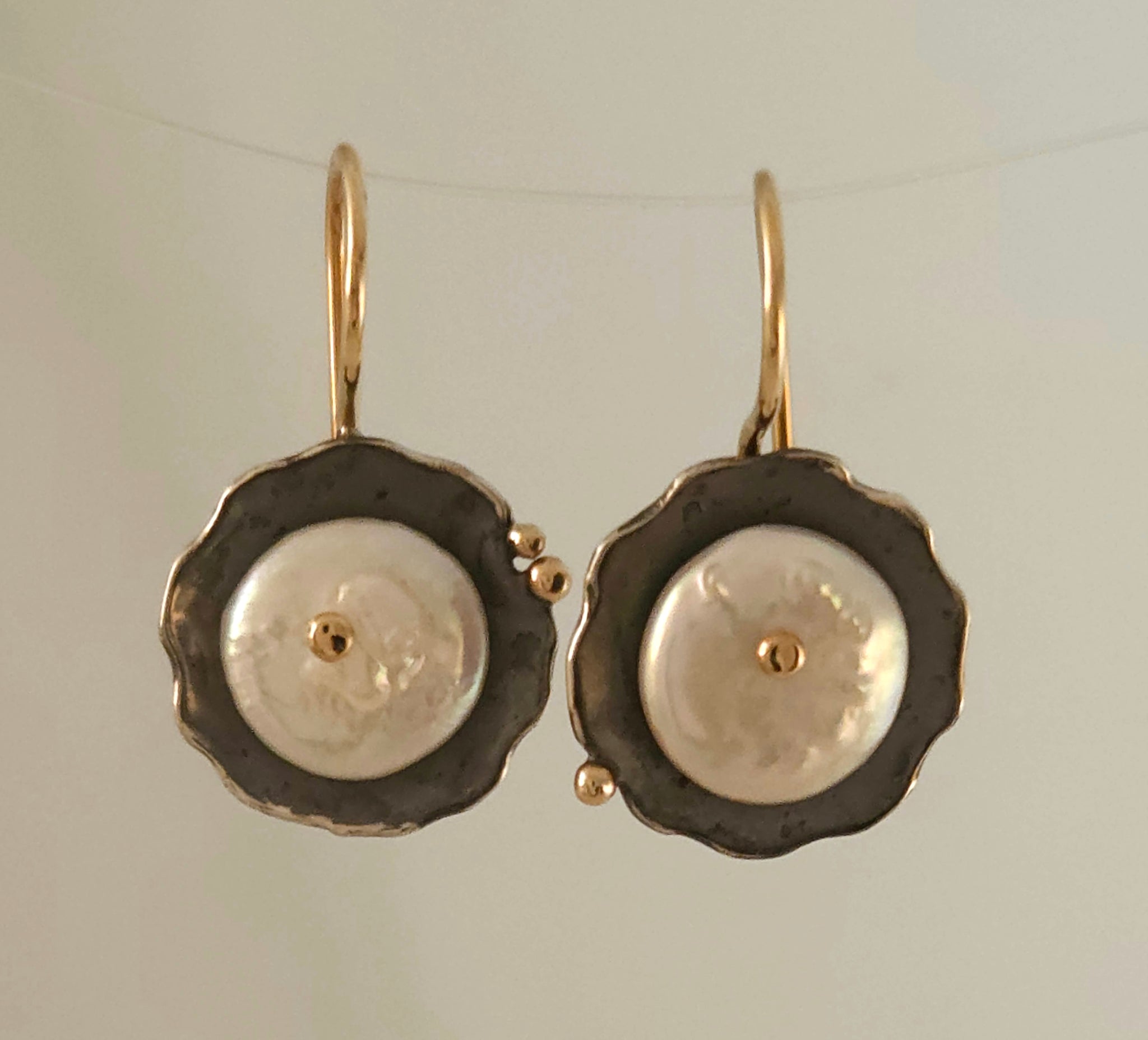 Pearls go with everything. The textured and oxidized sterling cup holding the coin pearl is accented with a few 14KY beads. The coin pearl is set in place by a bead of 14KY. Asymmetrical beads float outside textured sterling cup edge. One earring has one bead and the other has two 14KY beads. 14KY ear wires complete the design beautifully. The coin pearls are highly lustrous with gold hues. These earrings speak versatility and could easily become the "go to" earrings.