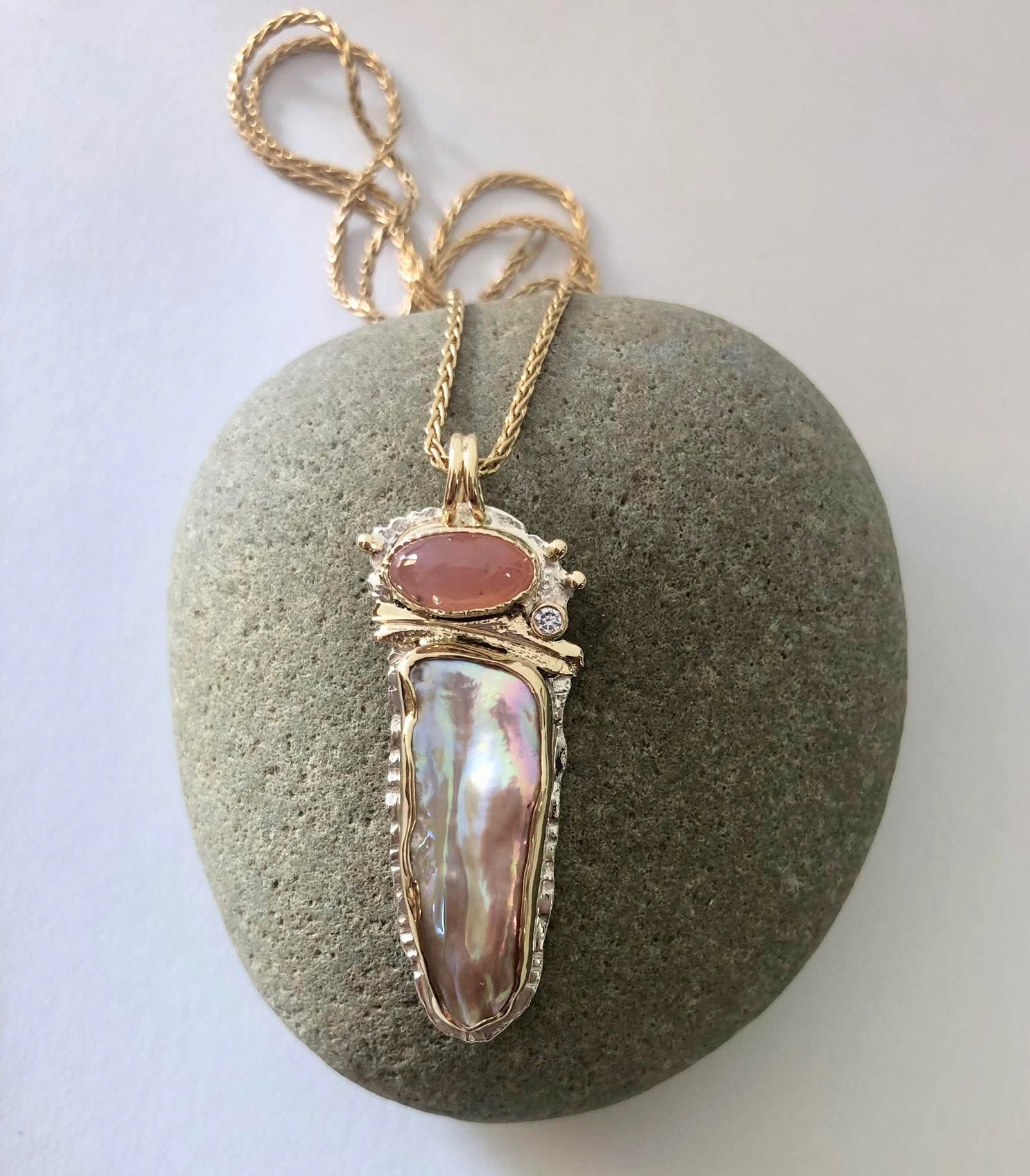 This rich and lustrous golden pearl has champagne pink hues, making the grossular garnet the perfect complement to this stunning freshwater pearl. Lori's aesthetic turned natural, textured and asymmetrical, while setting and designing for this pearl. The perfect balance of sterling and 14ky encompass and bezel the stones. The rich, pastel metallic pearl was hand selected by Lori. As pearls often are, it was a challenge to photograph, as it is difficult to catch all of the luster and colors shifting across this pearl. Gold, silver, rose and light blue nuances continually dance across it. The luster is stuller.