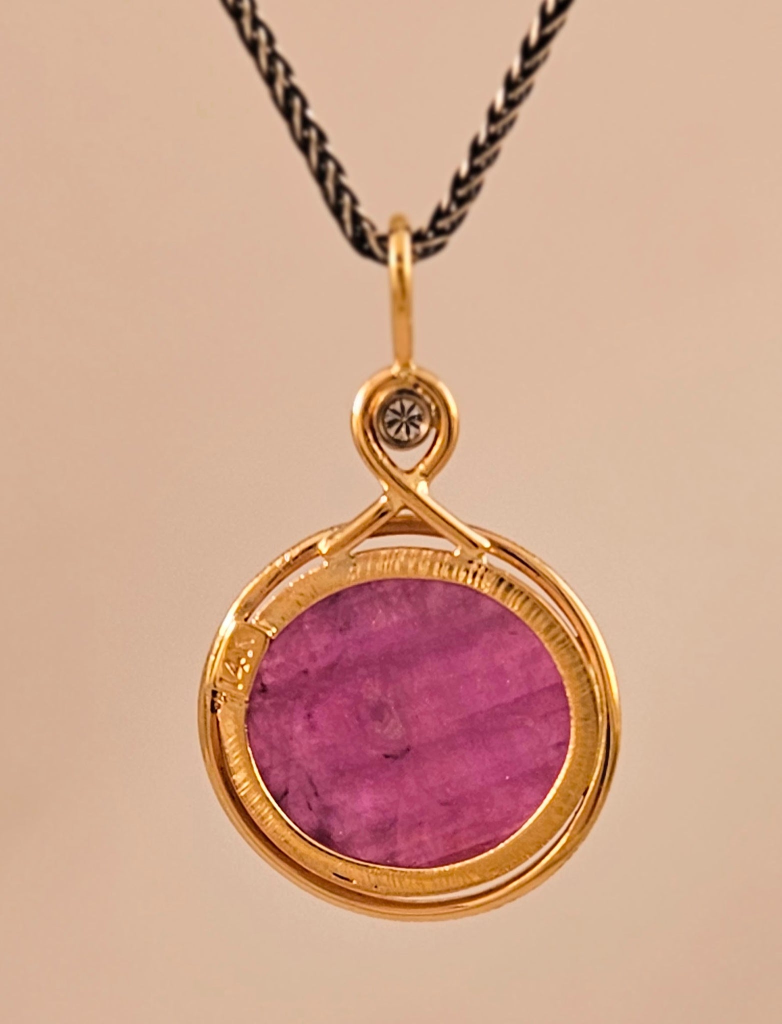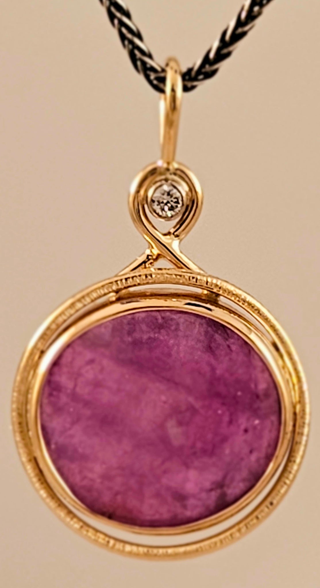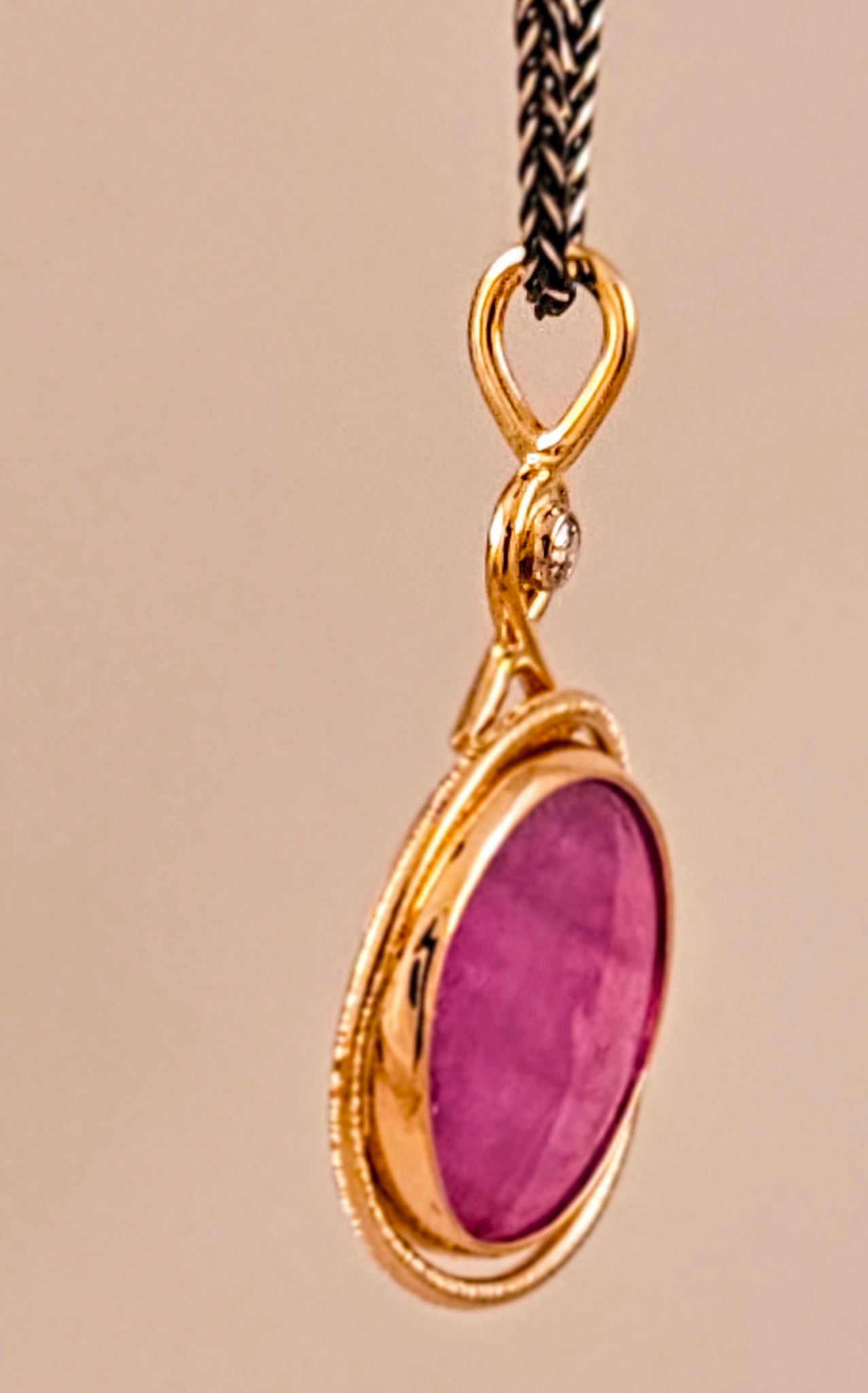 This stunning ruby, diamond and 14KY pendant has a simple textured 14KY wire circling the ruby and it's bezel. Another lightly textured wire loops around the diamond. The essence of this piece is simple elegance. It is reminiscent of ancient middle Eastern jewelry circa 5000-2000 BC.